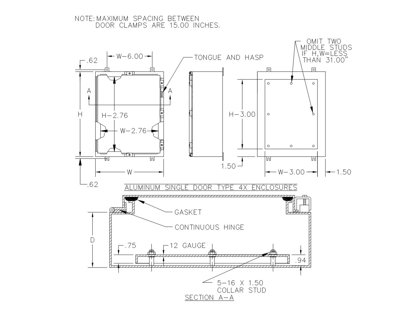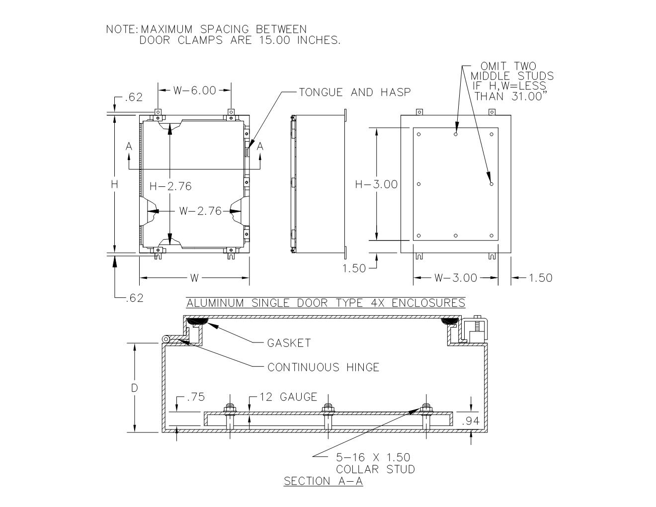 TYPE 4X SINGLE DOOR ALUMINUM WALL MOUNT HINGED COVER ENCLOSURE W/ CLAMPS